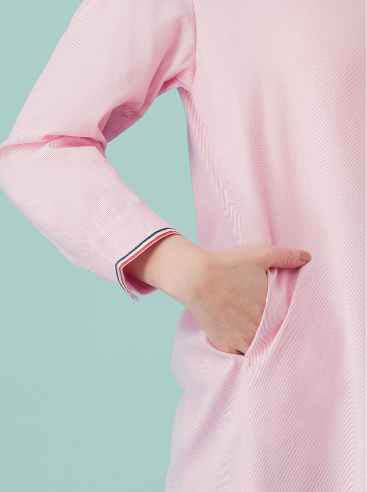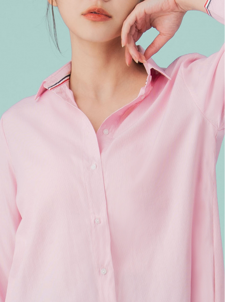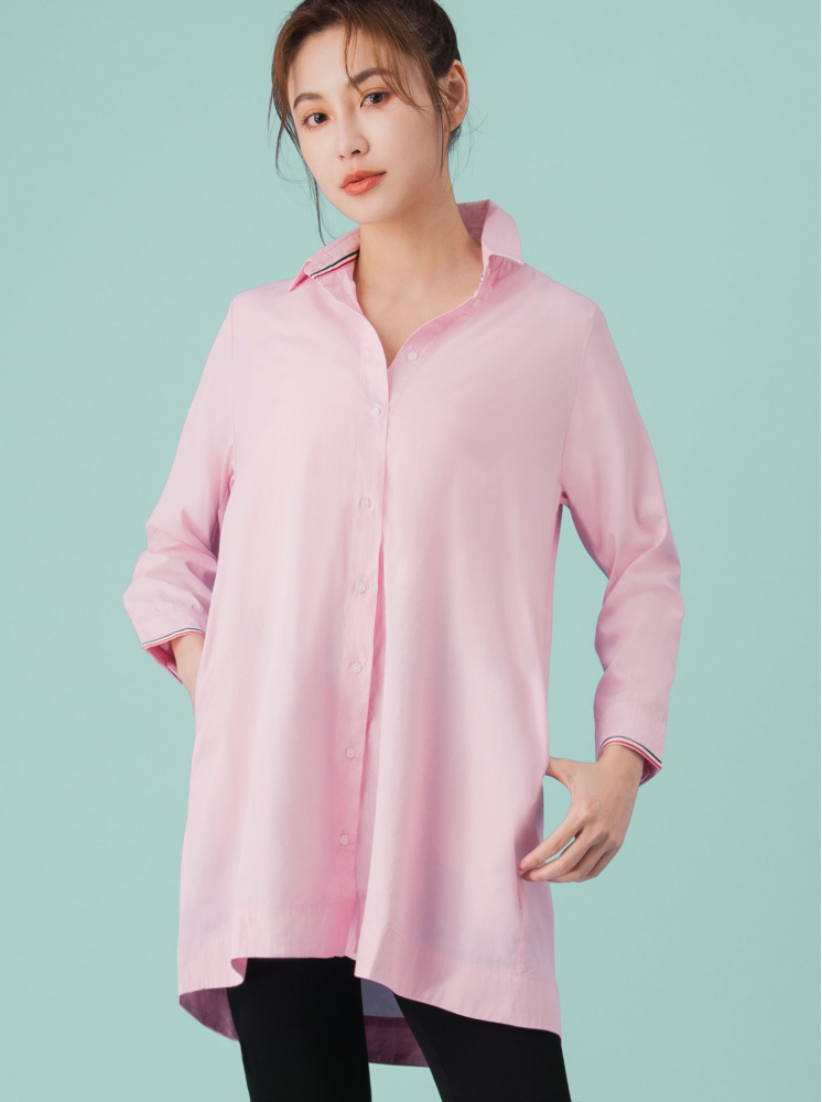 • 透氣綿長版撞色織帶襯衫-粉