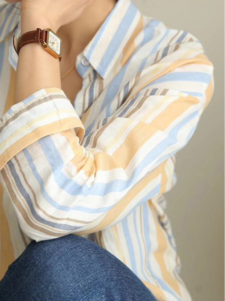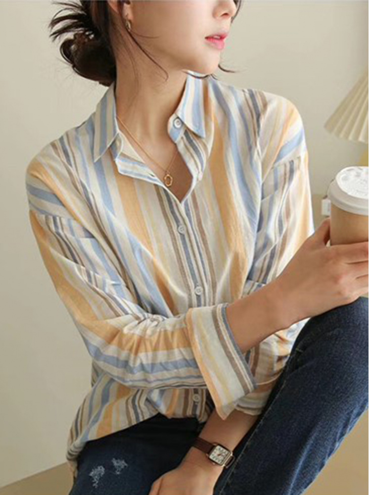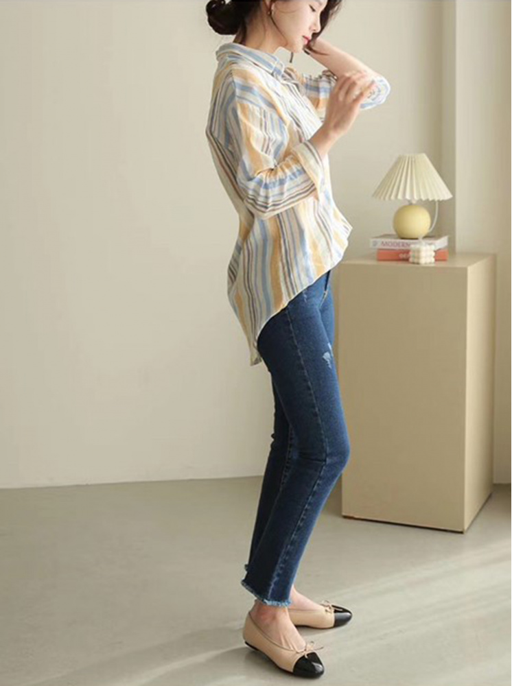 寬鬆前短後長條紋襯衫-黃:選擇尺寸