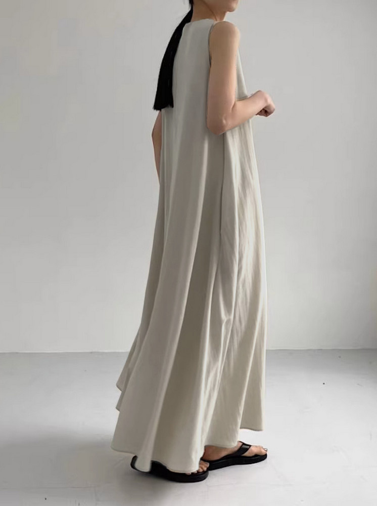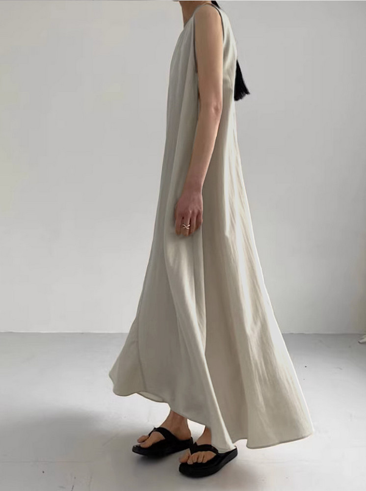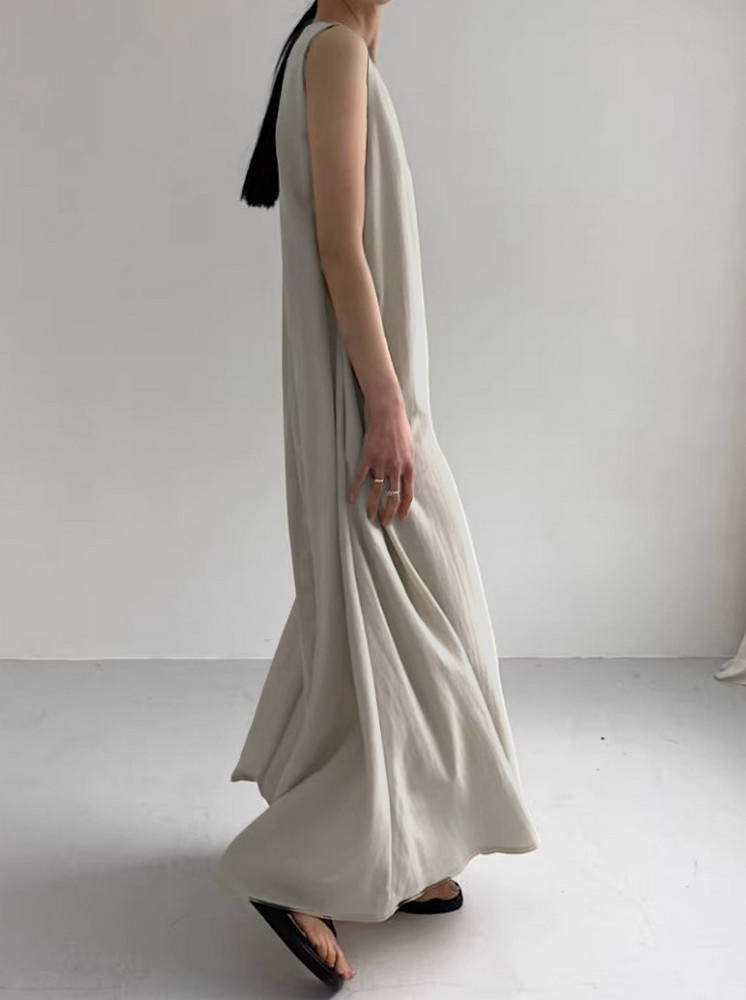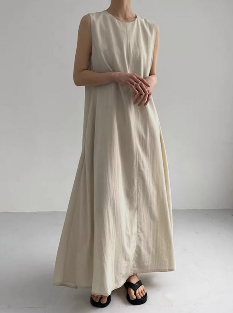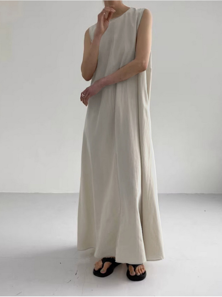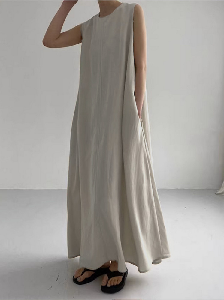 • 無袖寬鬆棉麻洋裝-米