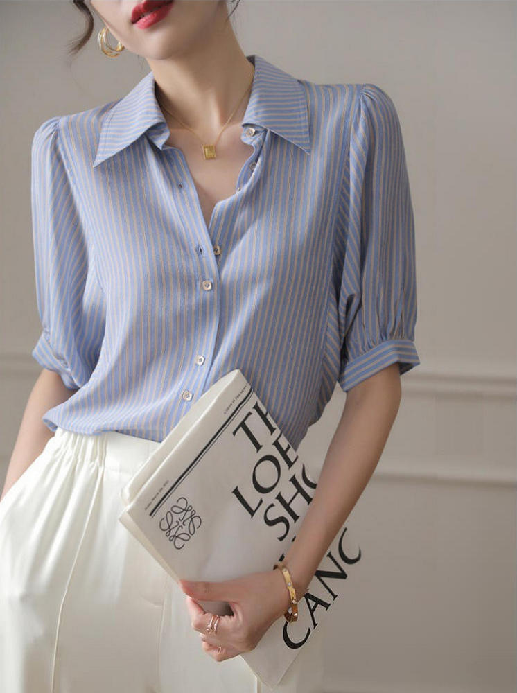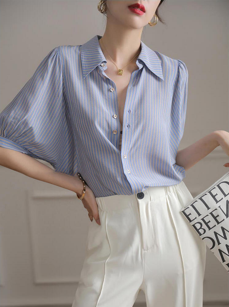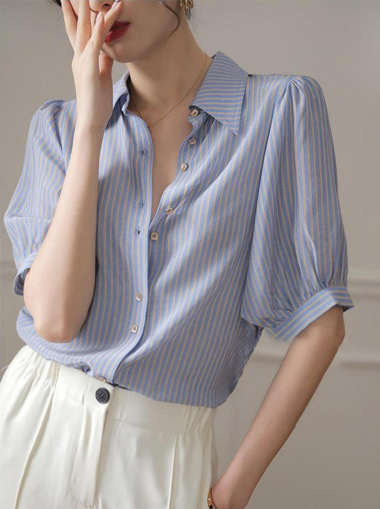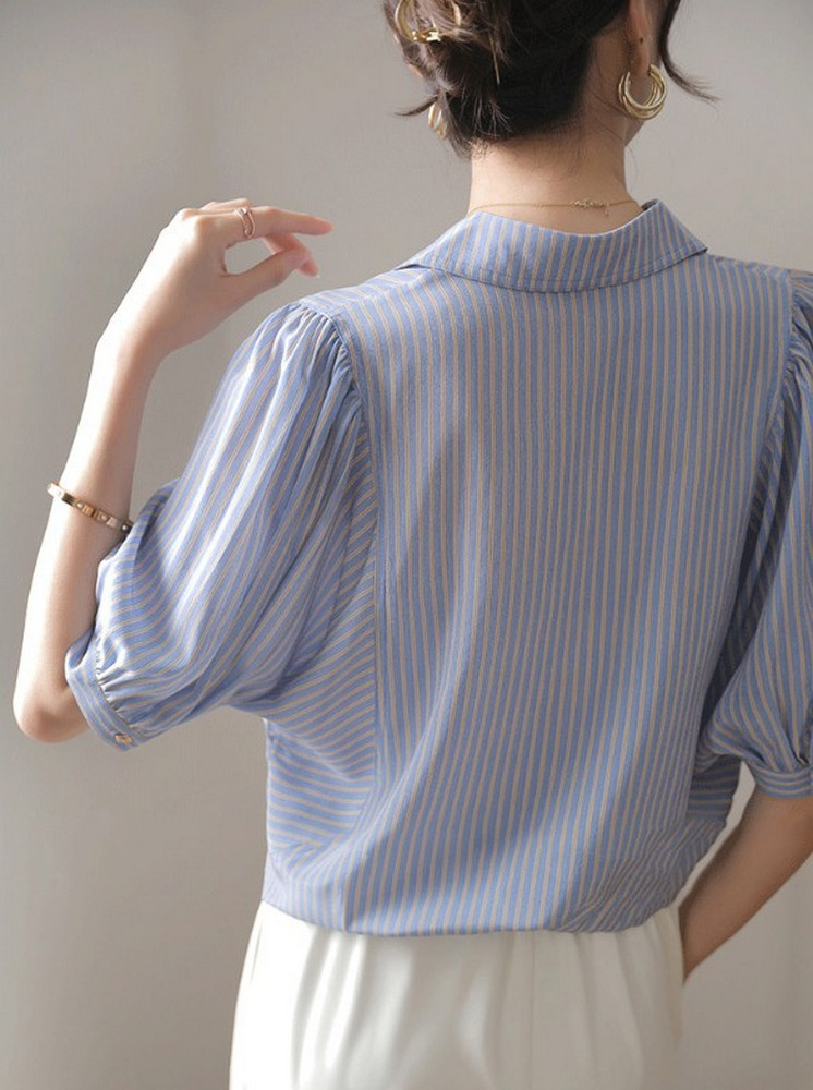 蝴蝶袖法式優雅襯衫-藍:選擇尺寸