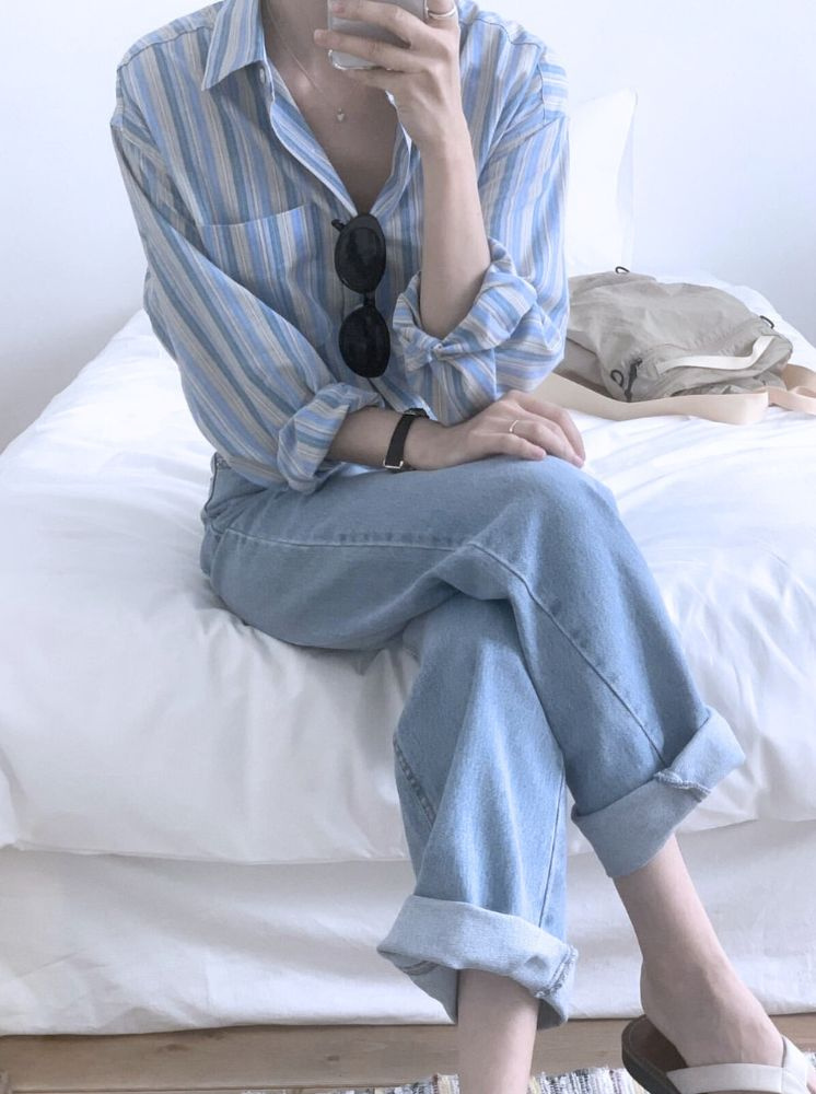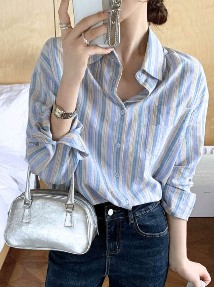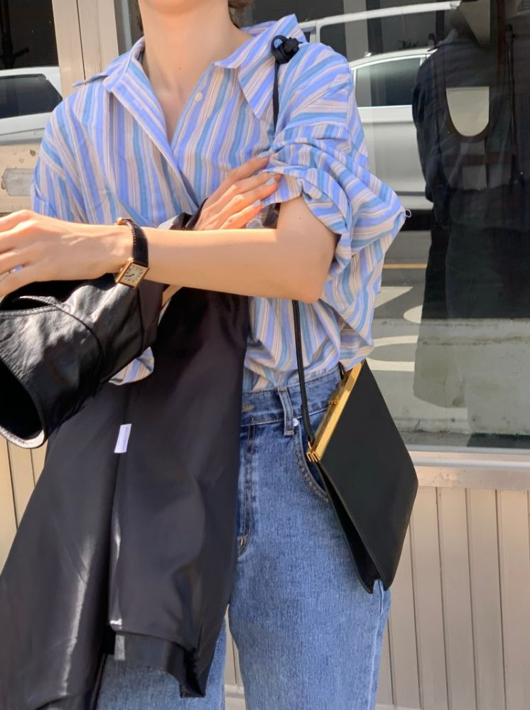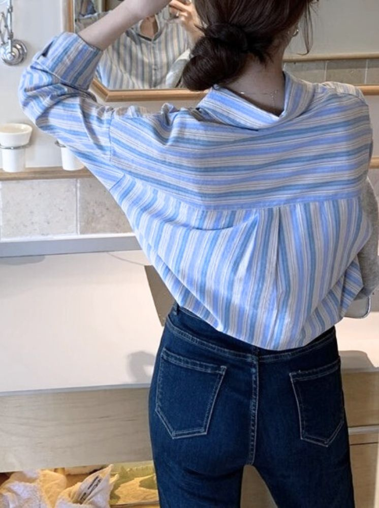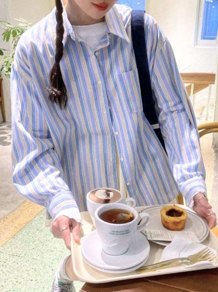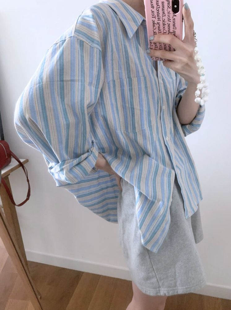 韓版撞色條紋落肩襯衫-藍:選擇尺寸