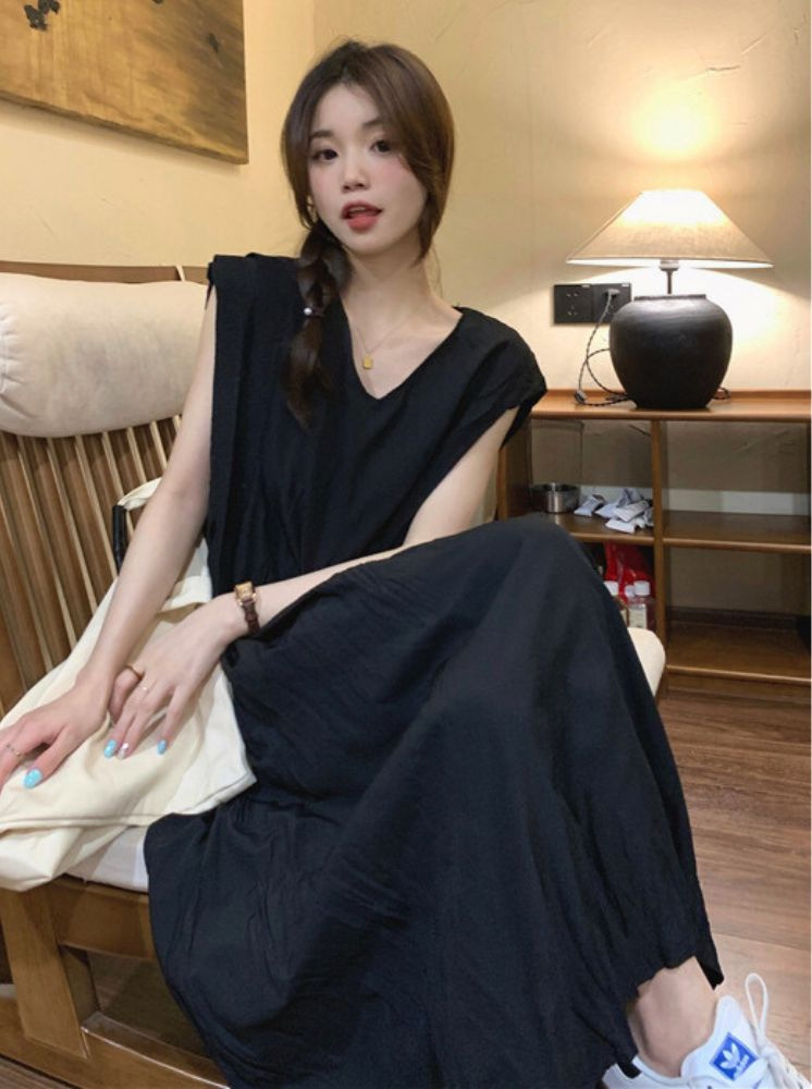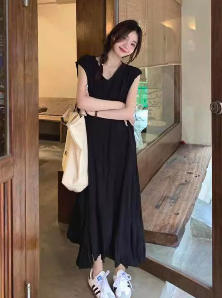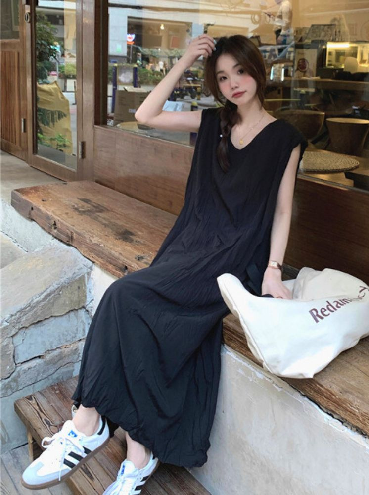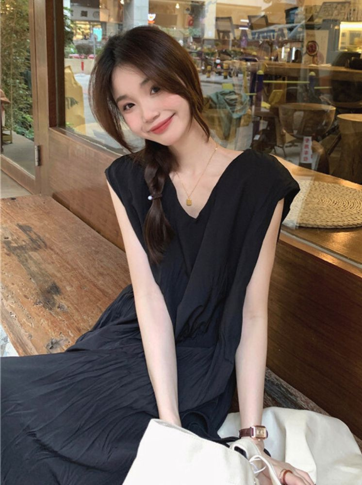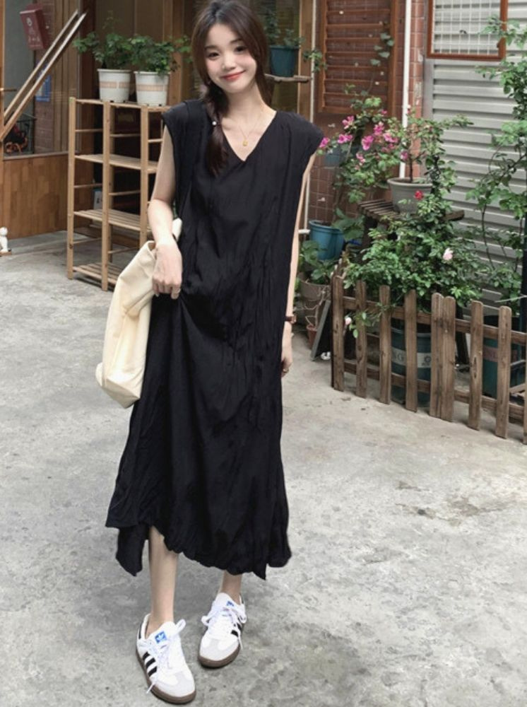 V領皺褶鬆弛感洋裝-黑:選擇尺寸