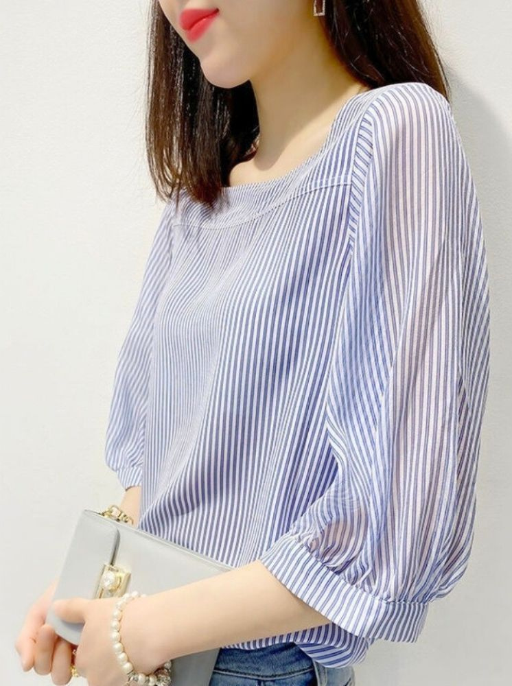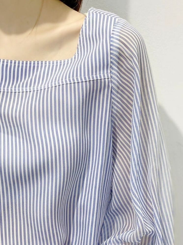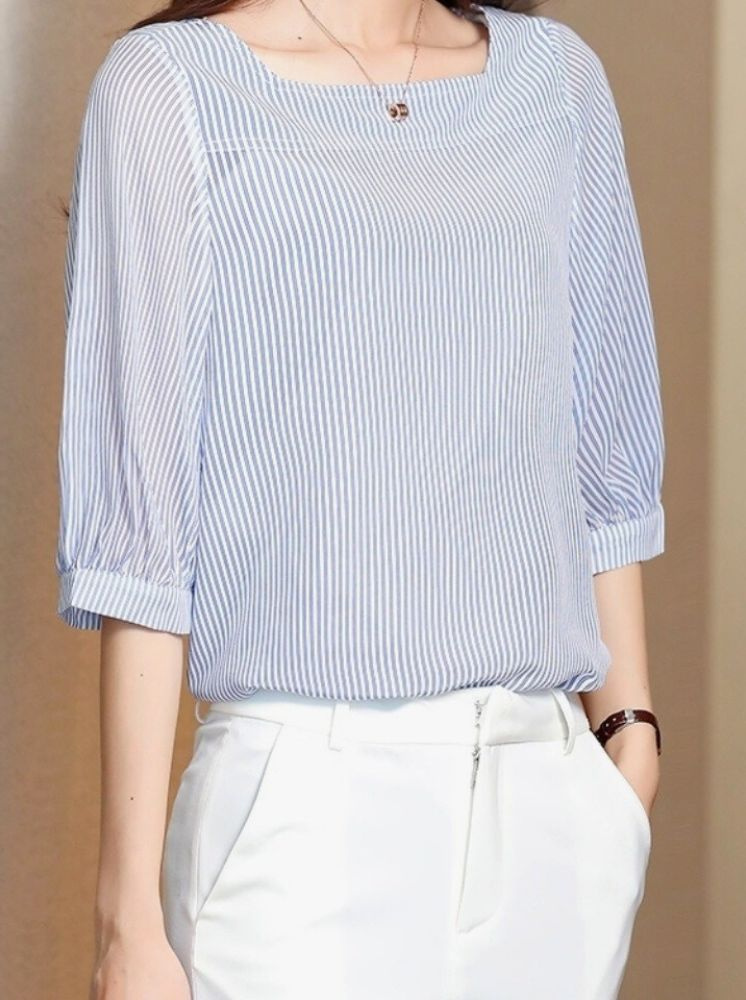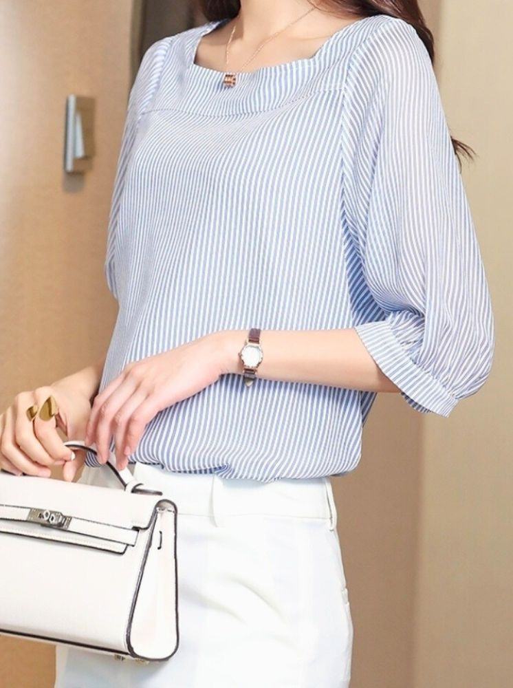 法式方領雪紡上衣-藍