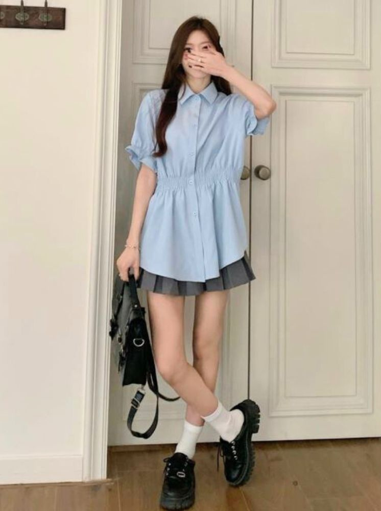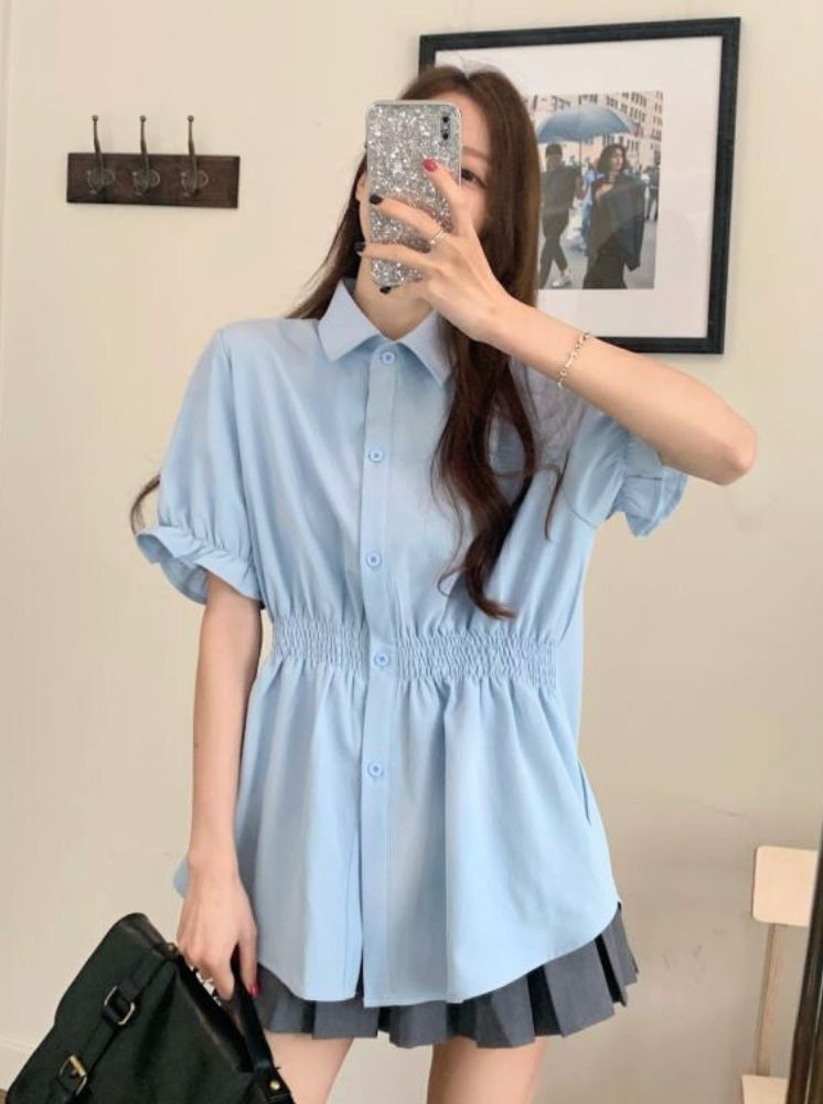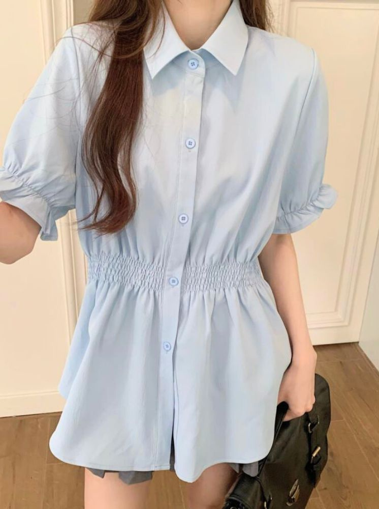 氣質收腰顯瘦襯衫-藍