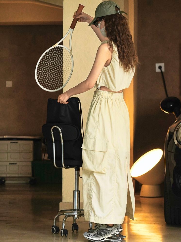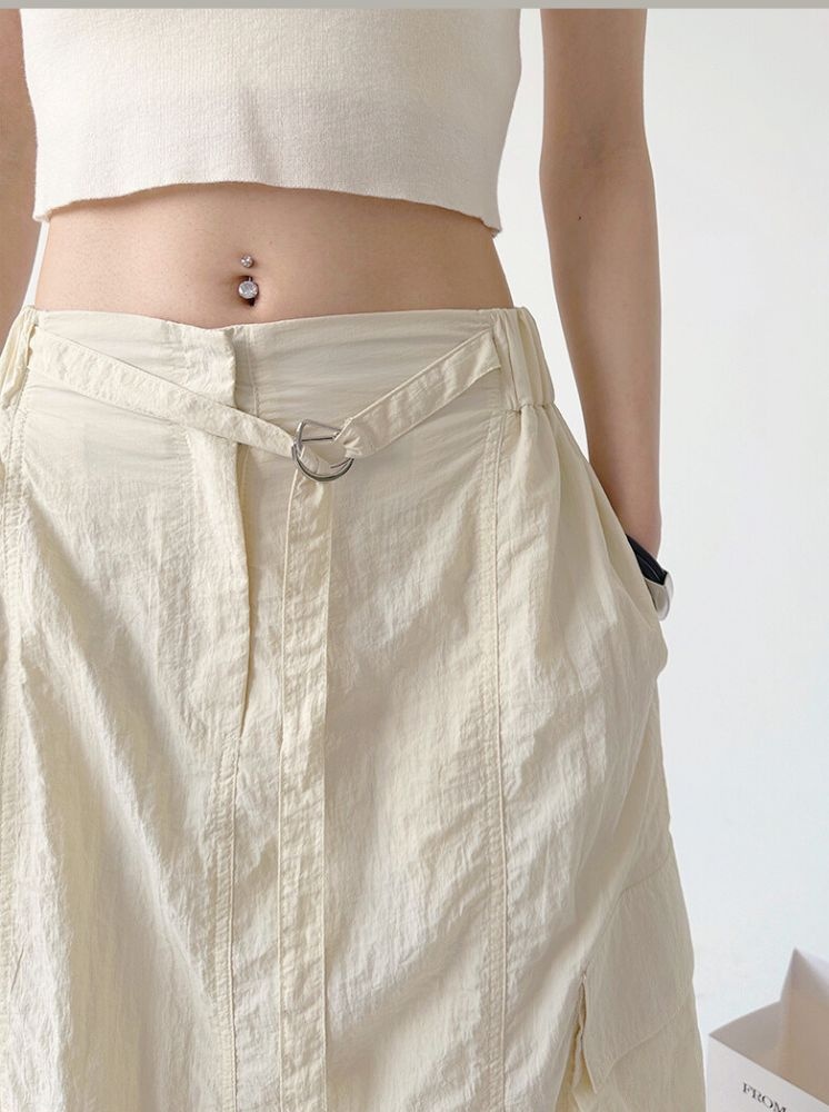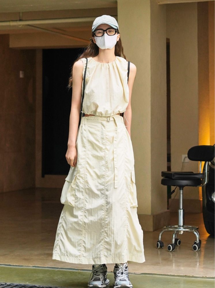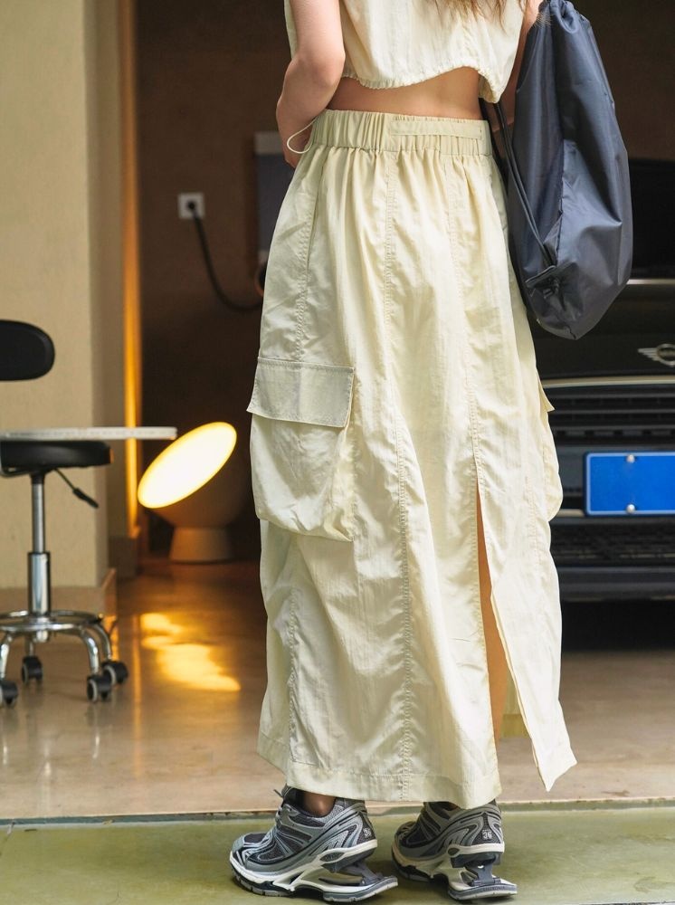 後鬆緊休閒工裝長裙-杏:選擇尺寸