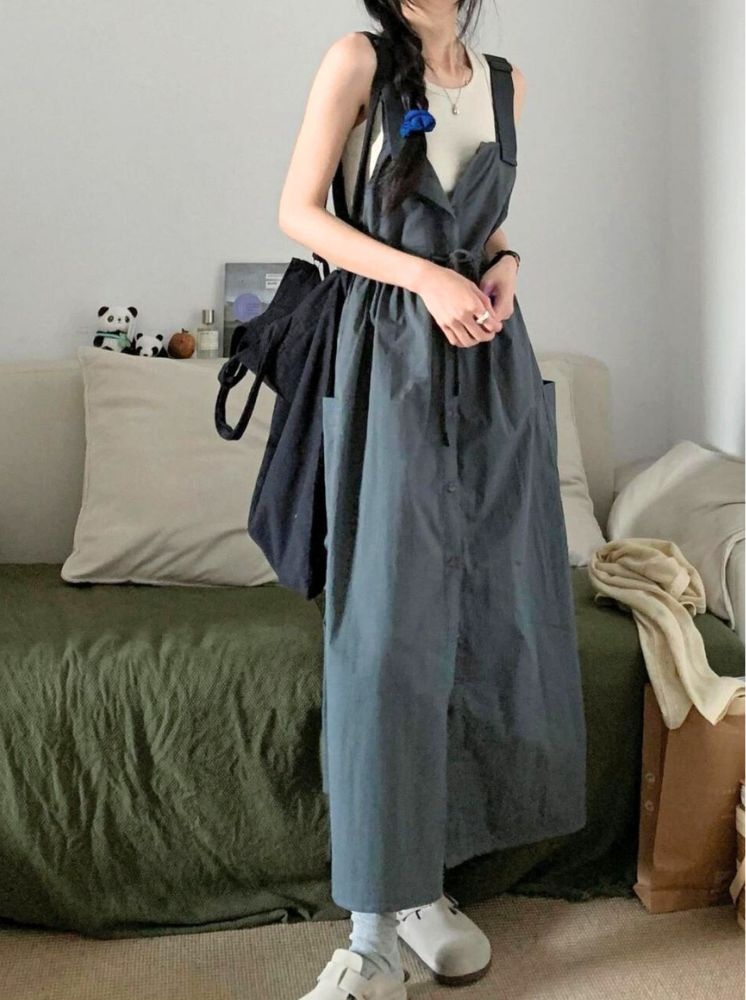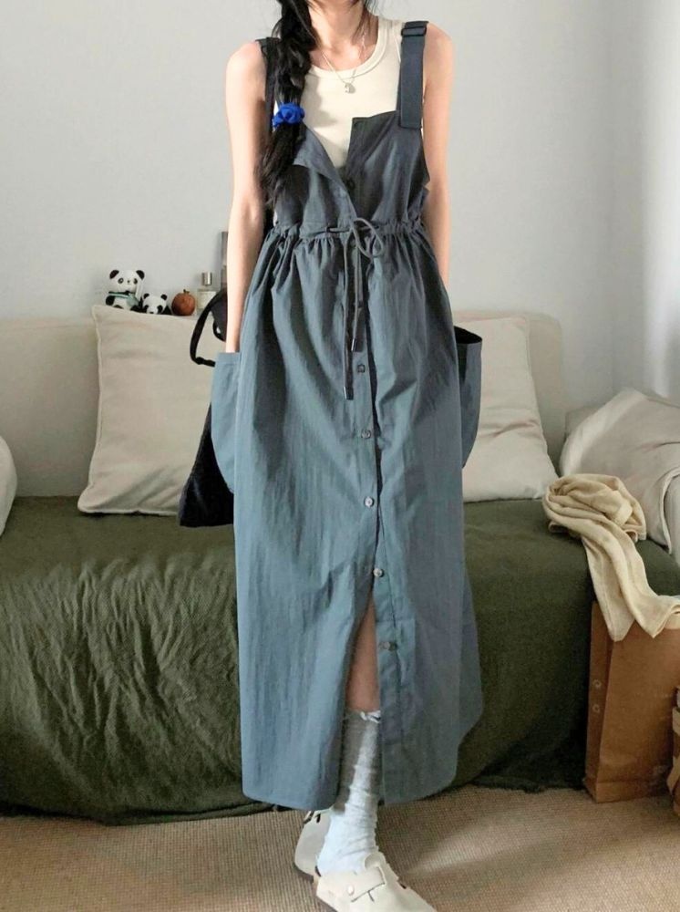 日系工裝吊帶洋裝-灰藍:選擇尺寸