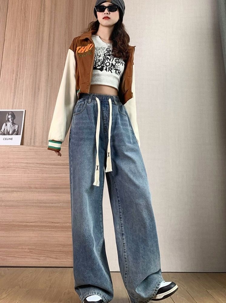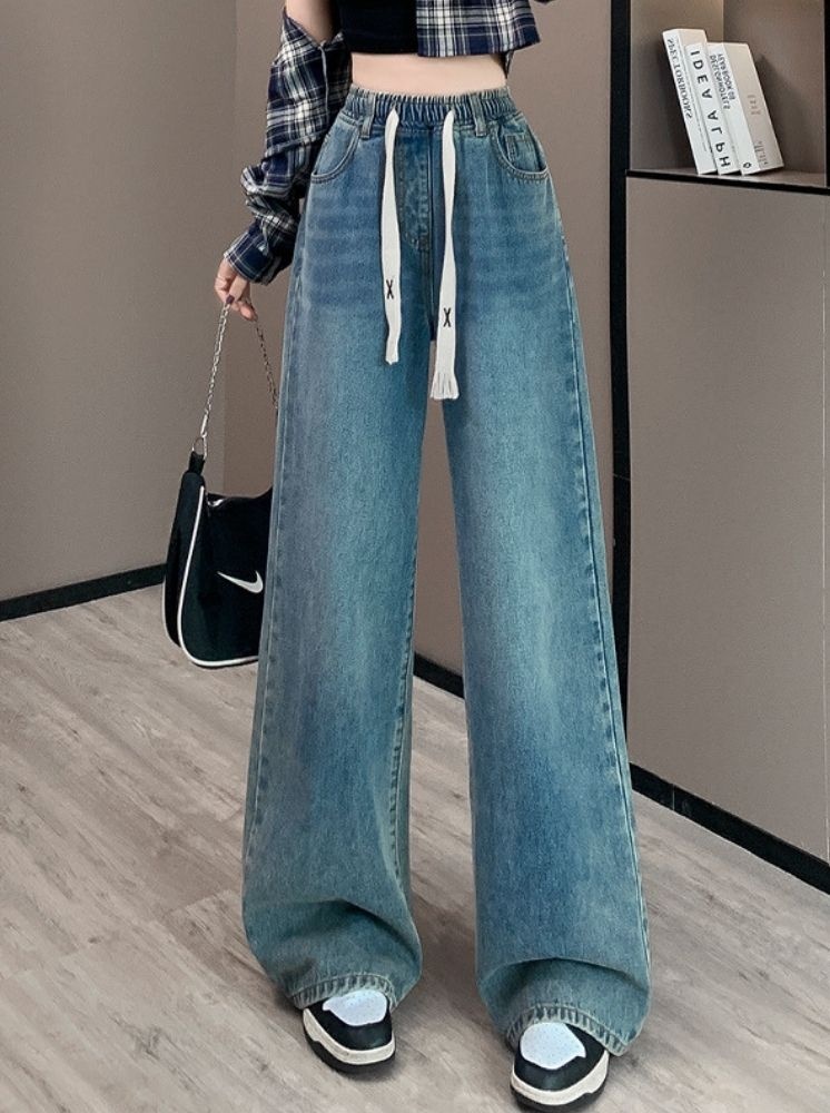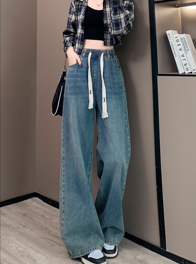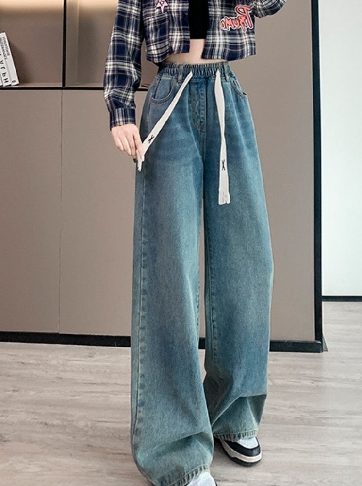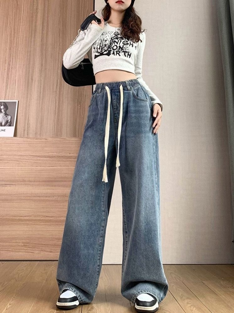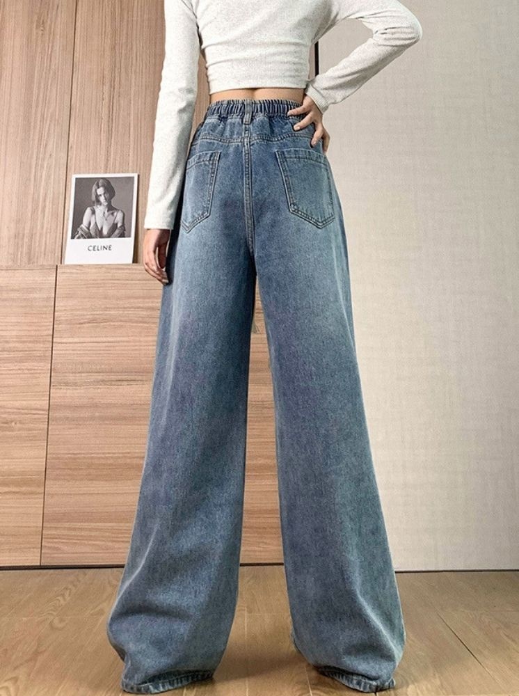 復古高腰闊腿牛仔褲-藍
