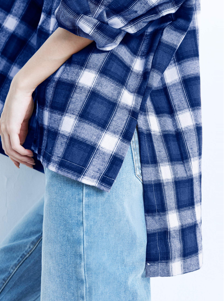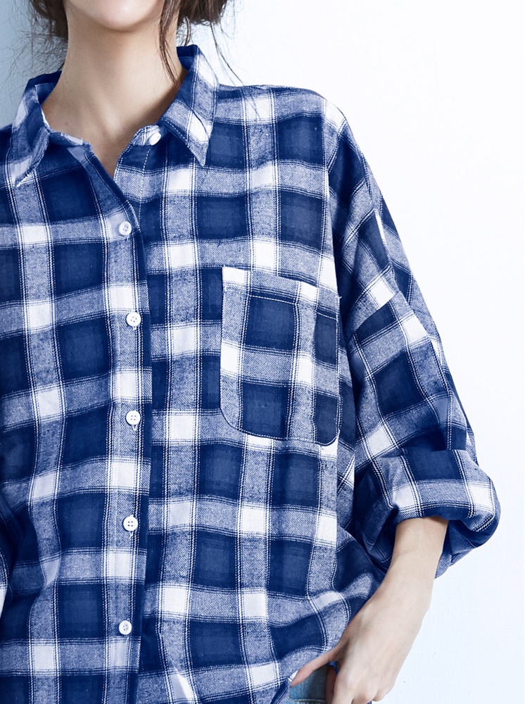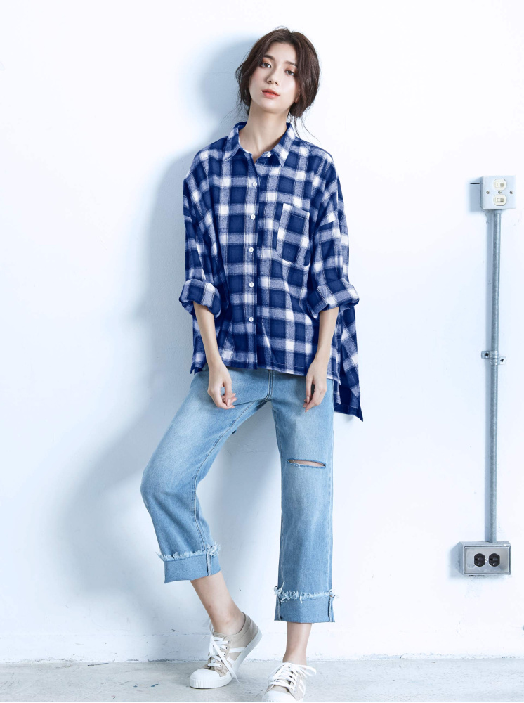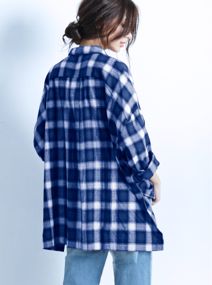 復古格紋前短後長襯衫-藍:選擇尺寸