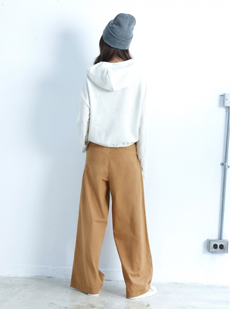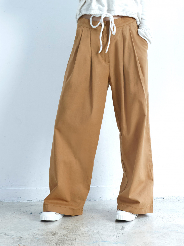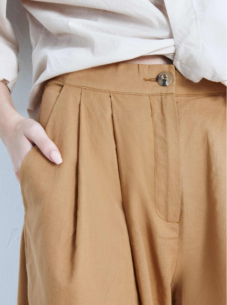 素面前打折棉麻寬褲-卡其
