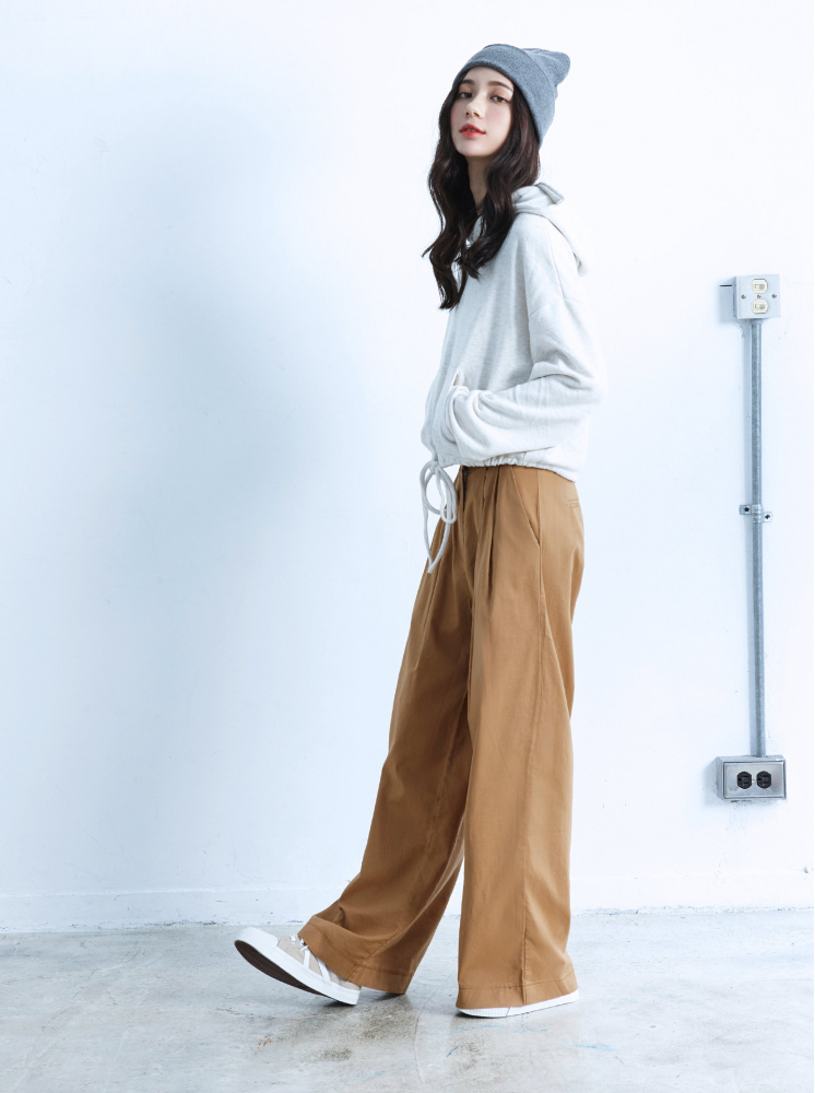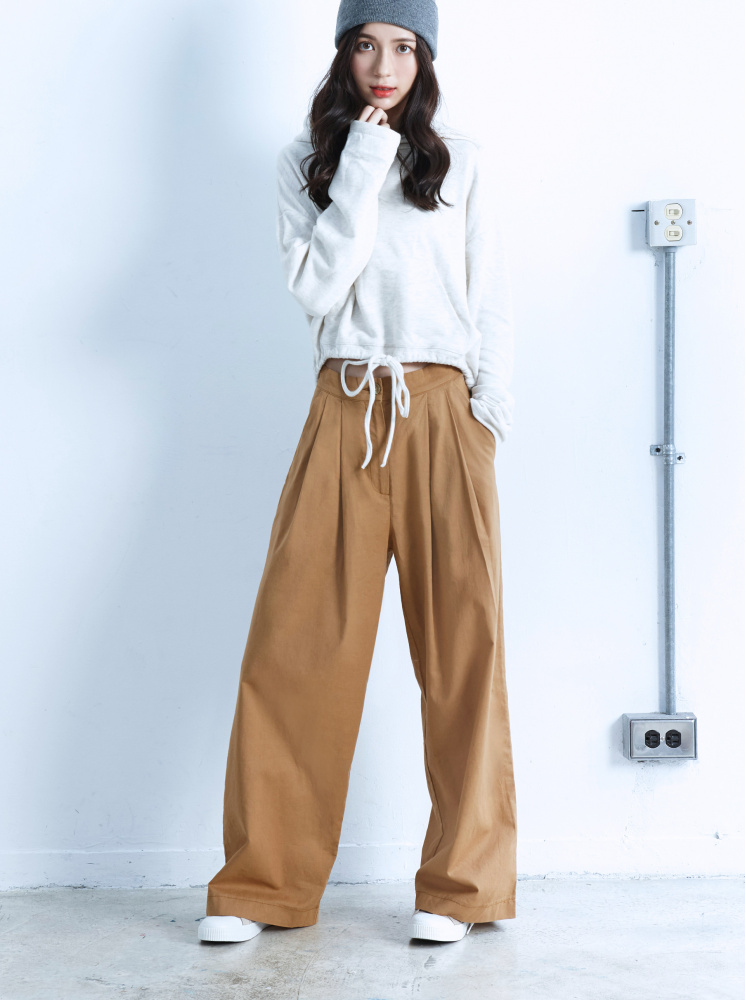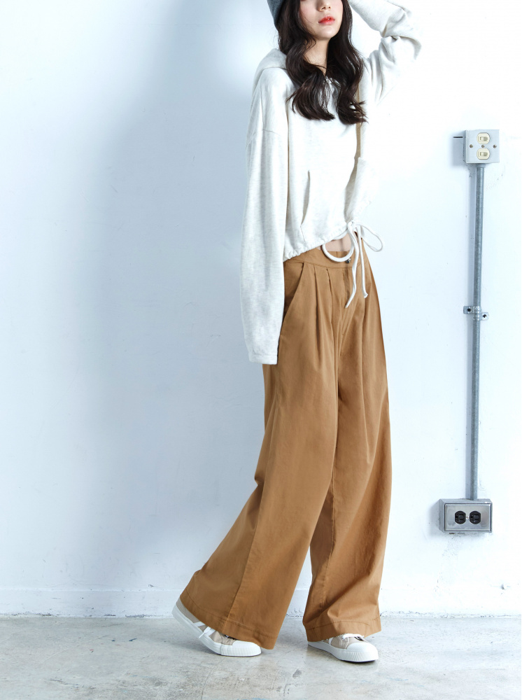 • 素面前打折棉麻寬褲-卡其