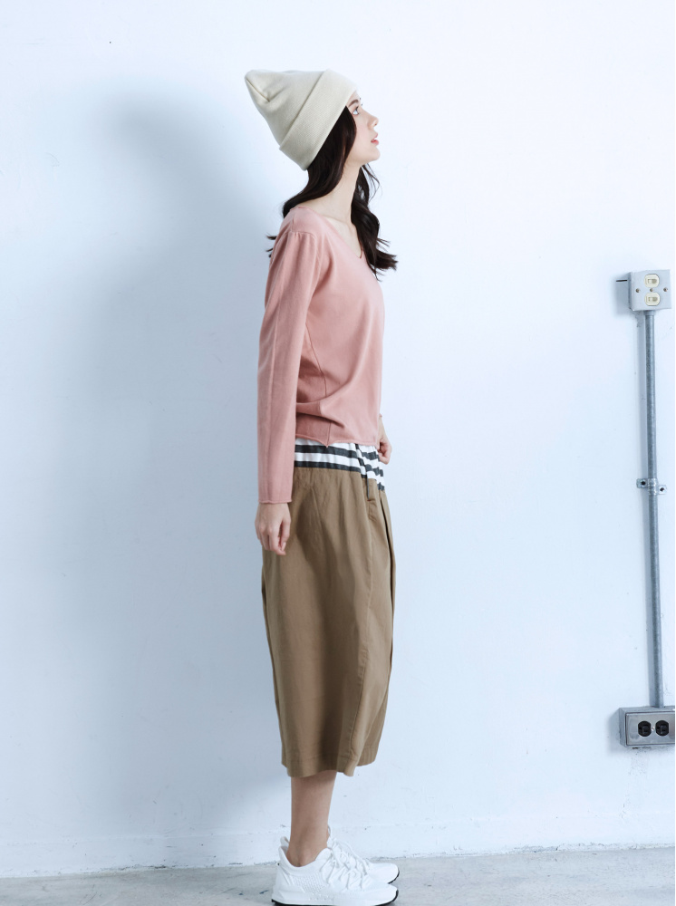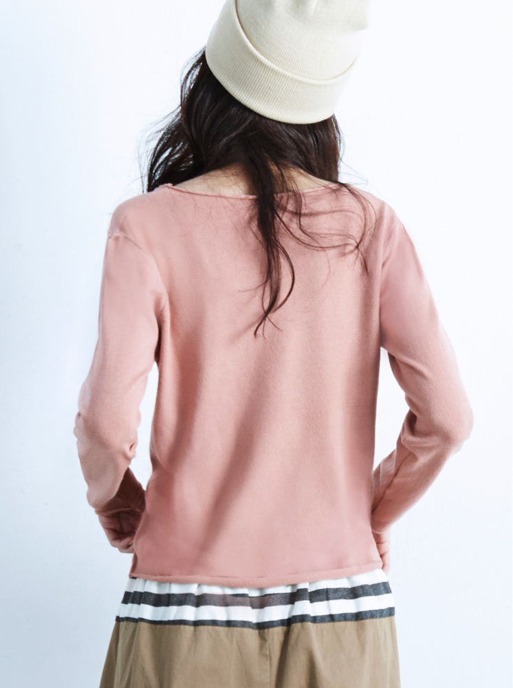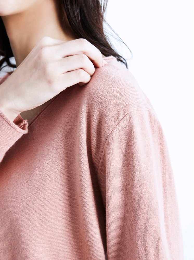 • 素面V領卷邊針織上衣-粉