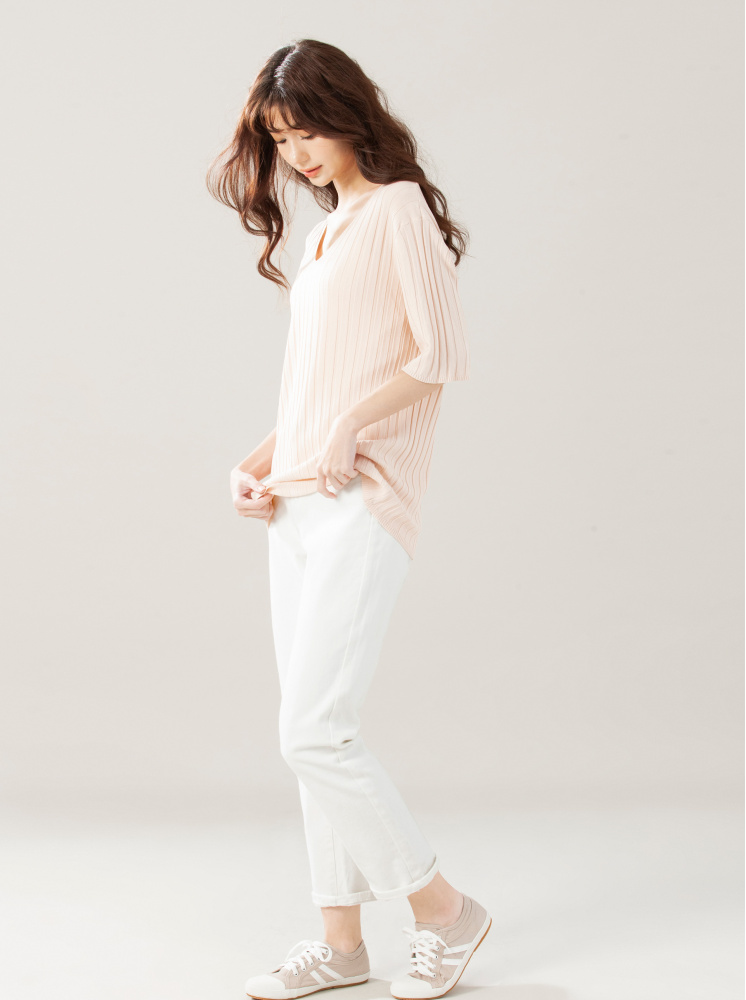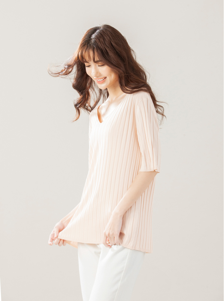 純棉V領坑條彈性上衣-粉:選擇尺寸