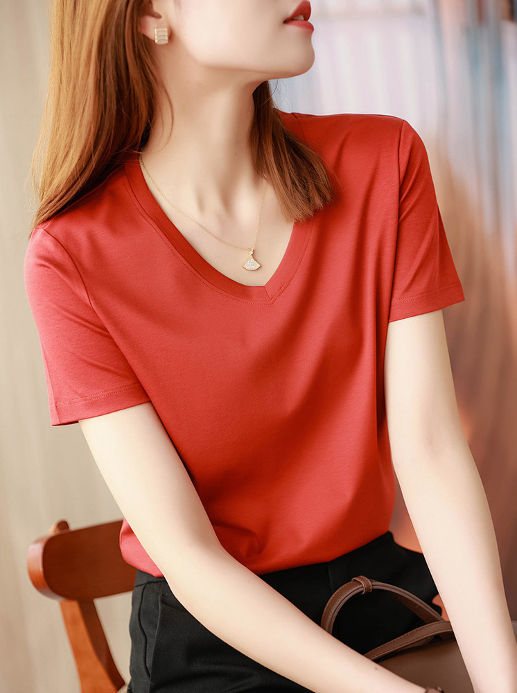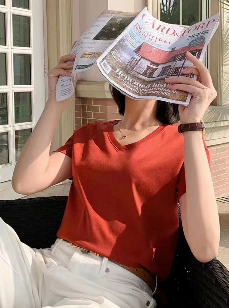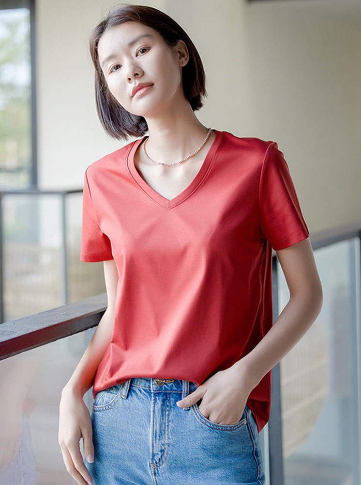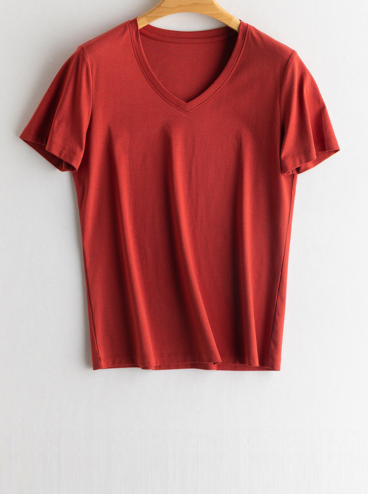 V領桑蠶絲涼感T-暗紅