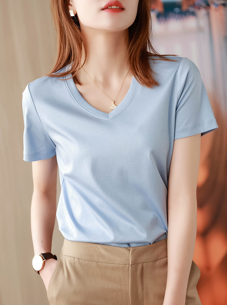 V領桑蠶絲涼感T-淺藍