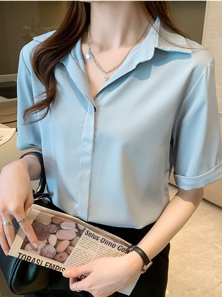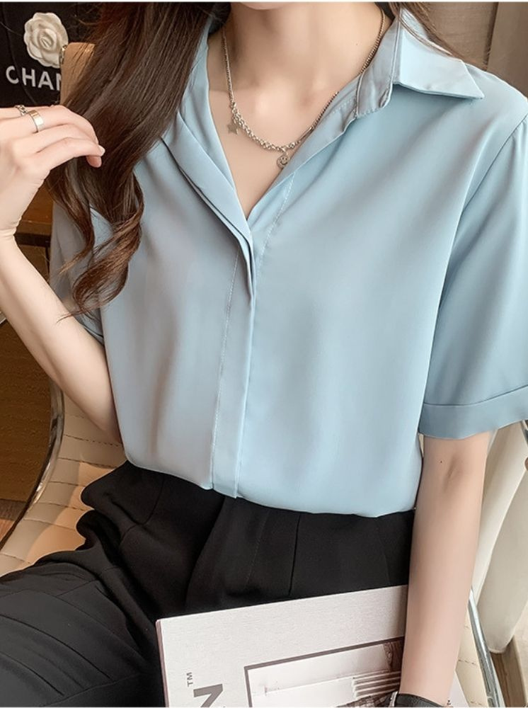 素雅短袖雪紡襯衫-淺藍