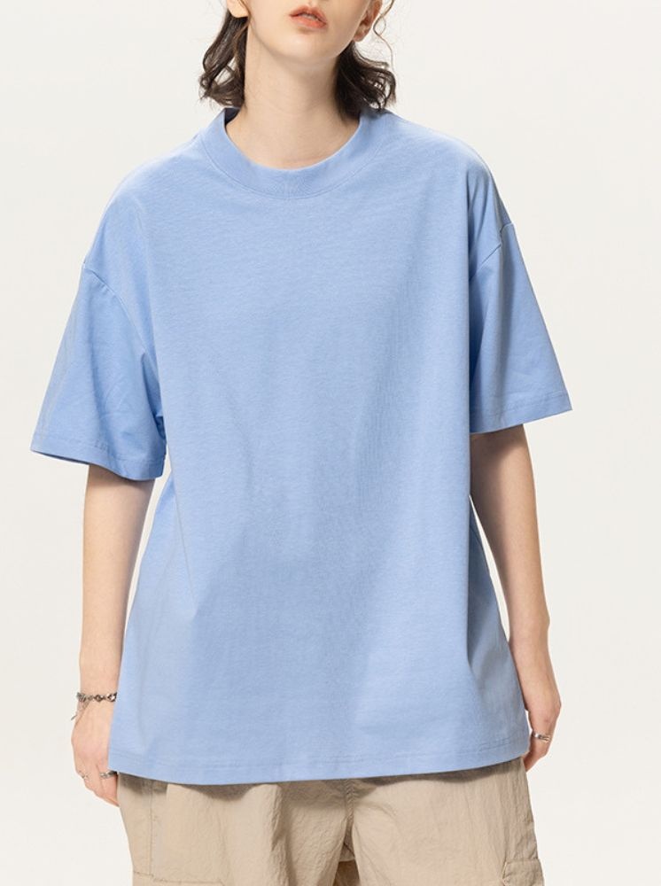 落肩圓領涼感T-藍