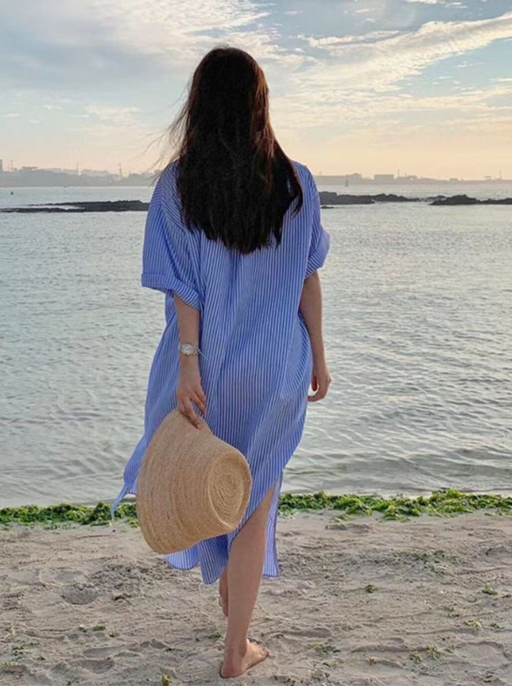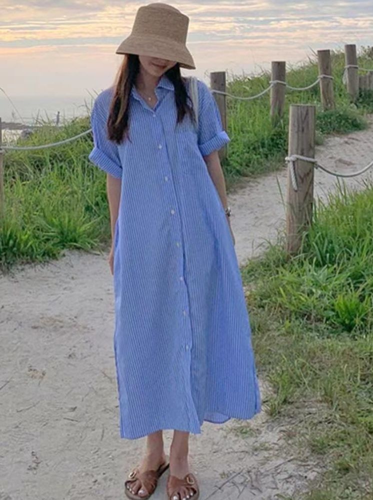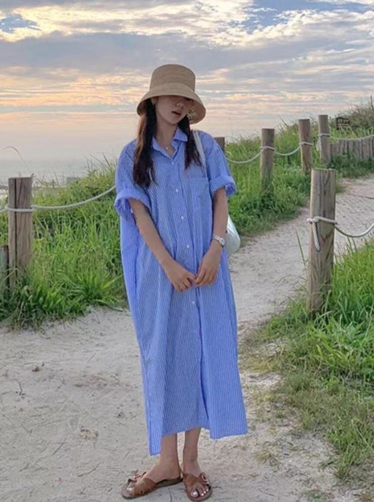 度假風條紋襯衫洋裝-藍:選擇尺寸